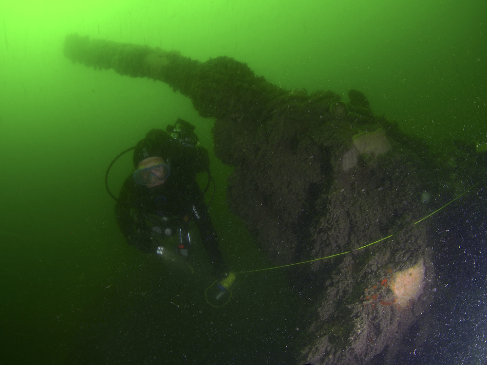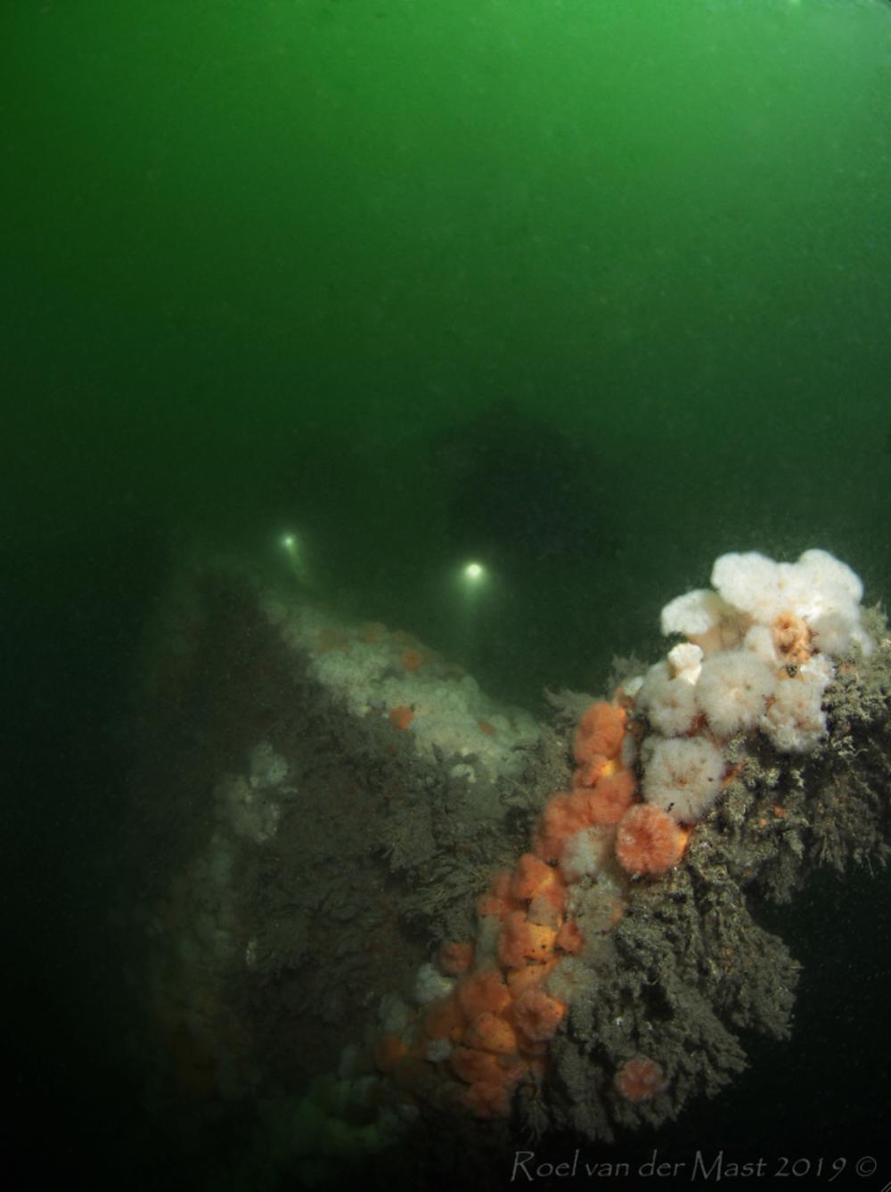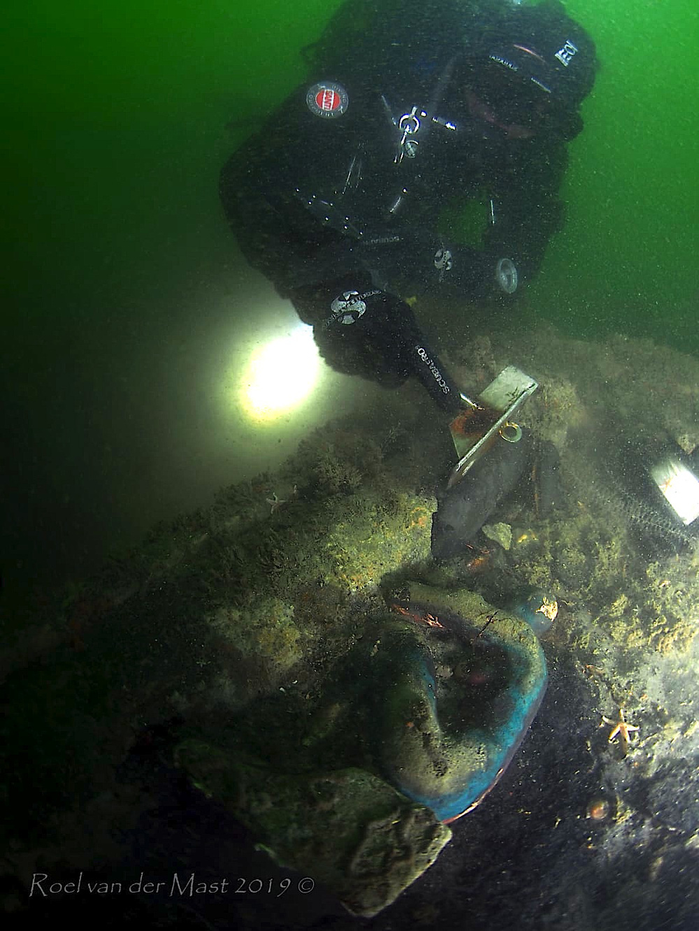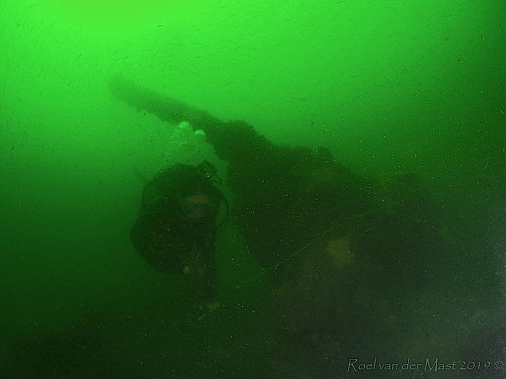 Delen van de Christiaan Huygens zijn ingestort. Wees voorzichtig. Sterke stroming tijdens springtij. Het is verboden om artefacten uit het wrak mee naar boven te nemen.