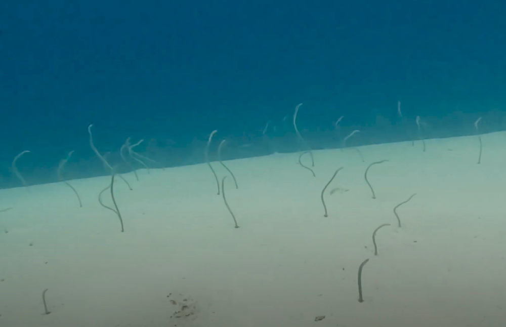 Eel Garden is precies wat de naam doet vermoeden, een palingtuin. Je ziet er tientallen uit de witte zandbodem steken, wiegend op de deining van het water. Tuinalen zijn bijzondere dieren. Ze leven in permanente buisvormige holen op de zandbodem, waar ze zonder hun behuizing te verlaten naar voedsel happen. Je duikt door een kanaal en vervolgens langs het rif om het zandplateau met de eel garden te bereiken. Blijf op de terugweg hangen in de ondiepte om de brede variëteit aan zachte en harde koralen in dit gebied te bekijken.