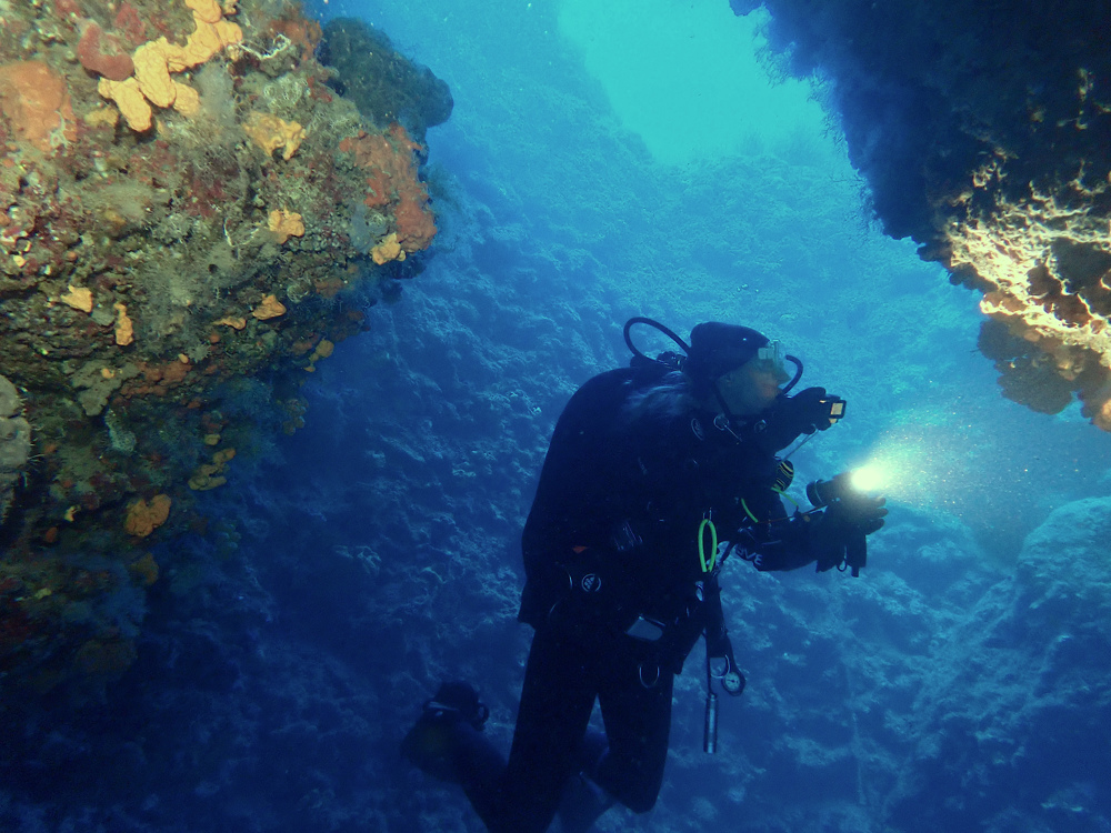 Het fijne, witte zand in de grotten van Jubilee Shoals Pinnacle stuift makkelijk op. Blijf weg van de bodem.