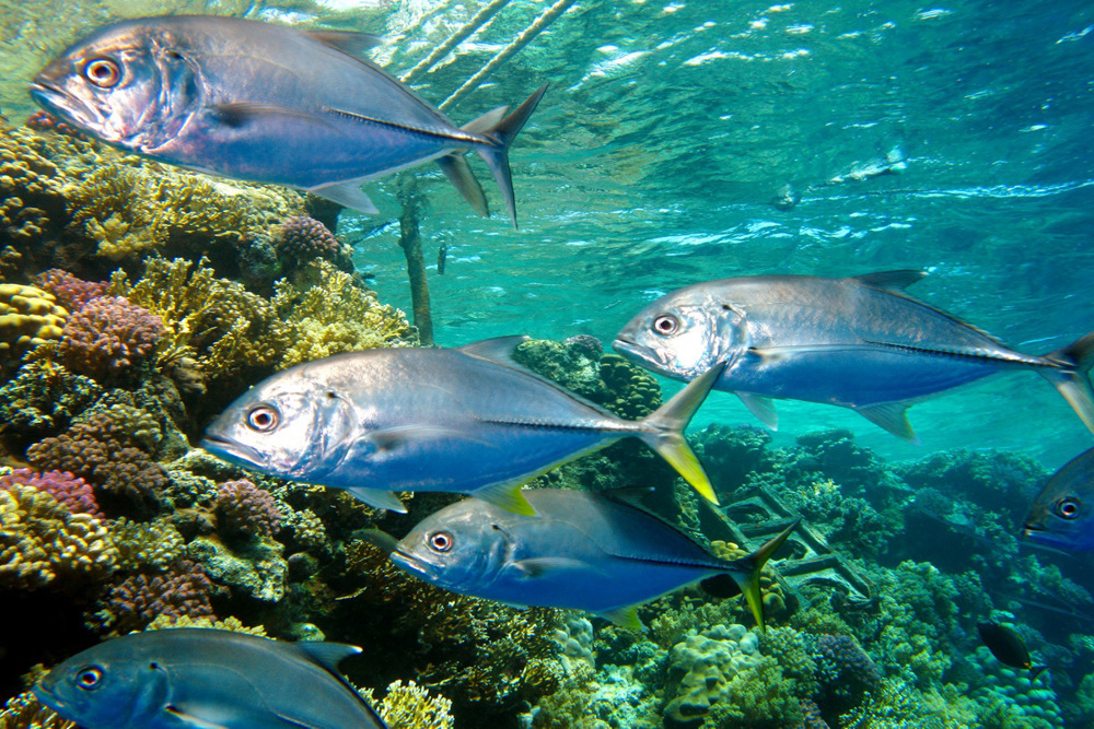 - Schildpad, dolfijn, witpuntrifhaai, napoleonvis, tonijn, barracuda, amberjack of geelstaart, anemoonvis, koraalduivel, zeeduivel, diklip, koraalvlinder, koraalvlinder, adelaarsrog