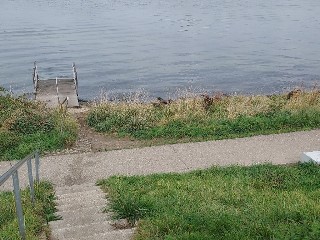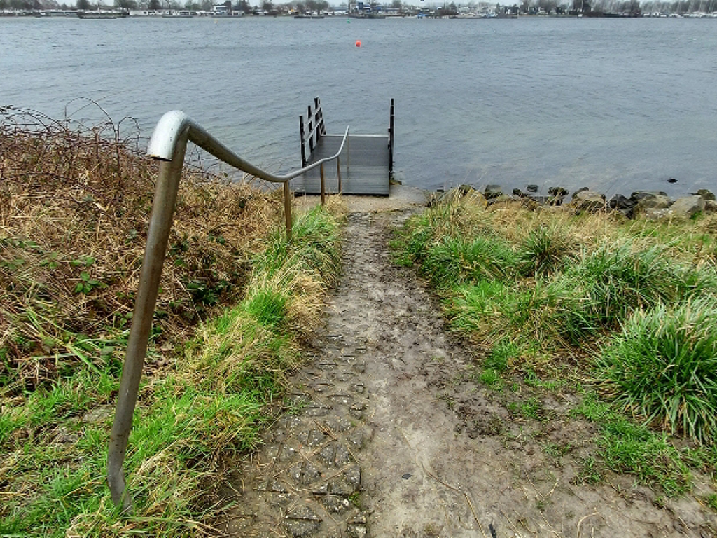 Bij Wolphaartsdijk ga je te water via een steiger met trap. Je kunt je op de steiger voorbereiden en via de trap te water.