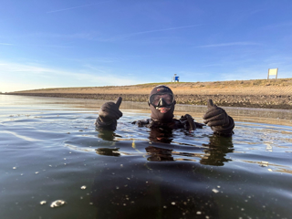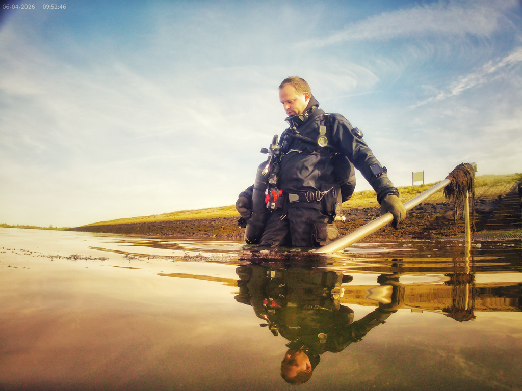 Je gaat bij de Bergse Diepsluis Oesterdam te water via een betonnen trap met leuning. Op een bord naast de dijktrap vind je informatie over Project Baseline, dat hier meetinformatie verzamelt. Doe ook mee. Geef jouw meting door aan de projectleider. Het meetpunt bevindt zich aan het platform op 10 meter diepte. Zie duikkaartje.