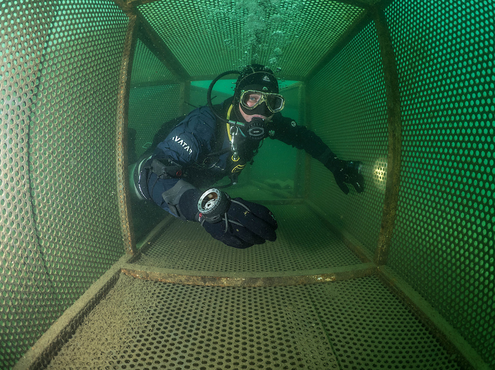 Na aankomst bij de Grüblsee registreer je je bij het duikcentrum. Je betaalt voor je dagpas en parkeerkaart en na een korte instructie en briefing ben je klaar om te gaan duiken. Je gaat het water in via een steiger. Je kunt vanuit het duikcentrum voedsel meenemen om de vissen te voeren. Dat is een waar spektakel. Er komen zoveel vissen op je af dat ze je zicht beperken Volg vervolgens het lijnentraject en duik door de kooien om er bij de steiger weer uit te gaan.
