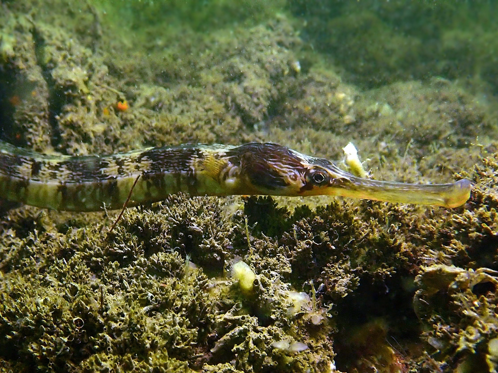 Veel stroming door springtij. Lastig te water. Buikstreepnemertijn, grote zeenaald, flamenco platworm, veel slibanemonen en zeeanjelieren