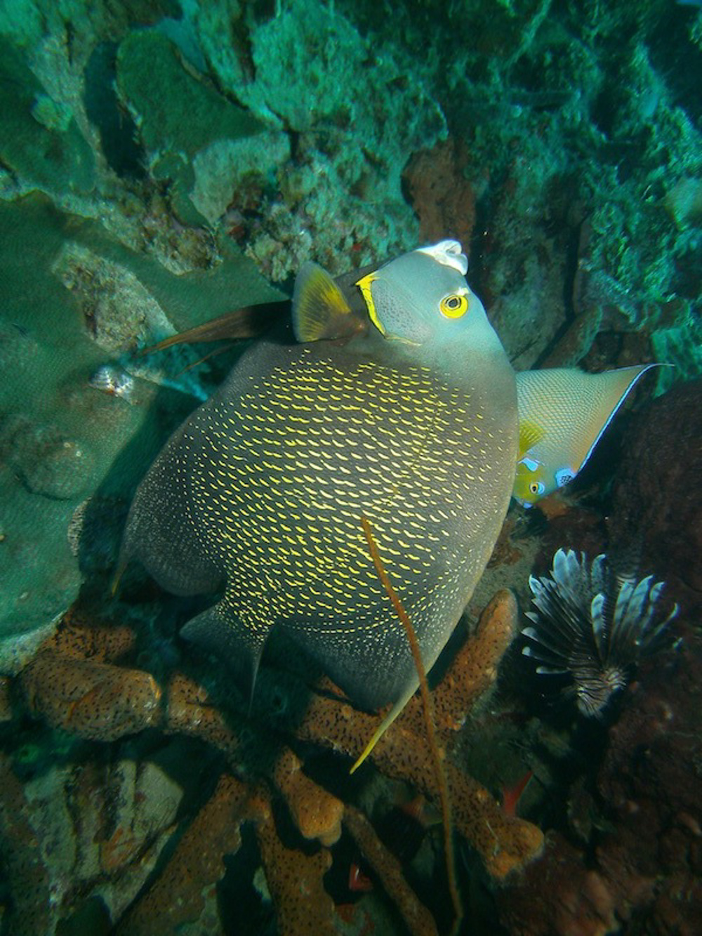 - Engelvis of keizersvis, inktvis, pijlstaartrog, trompetvis, zeeschildpad, zeepaardje, krab, koraal, tandbaars, papegaaivis