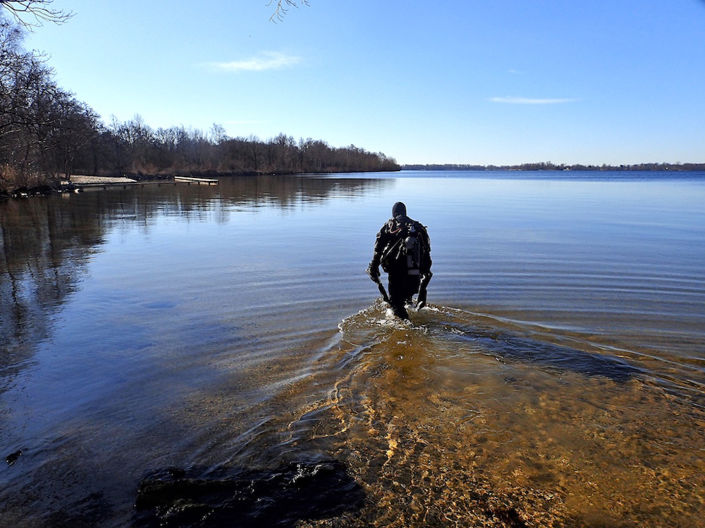 Parkeer bij duikplaats Spiegelpolder. Loop vervolgens in oostelijke richting, voorbij de duiksteiger, naar het strandje. Daar ga je via het trapje te water. Waadt door de opening in de afzetting richting de natuurstenen pier. Ga met je rug naar de kop van de pier staan. Zet nu een kompaskoers van 145 graden uit op de meest linkse boom, aan de overzijde van de plas. Loop nu een stukje vooruit en trek je vinnen aan. Zie kaartjes.