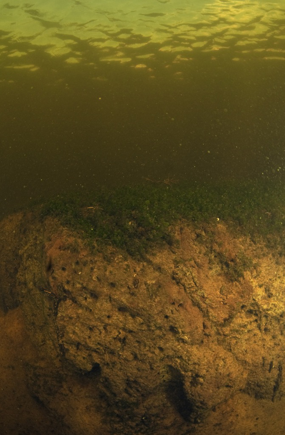 Ga bij de Zegerplas te water vanaf de steiger. Zwem een stuk van de drop-off af en kijk omhoog. De zwarte wand steekt mooi af tegen het bruine water.